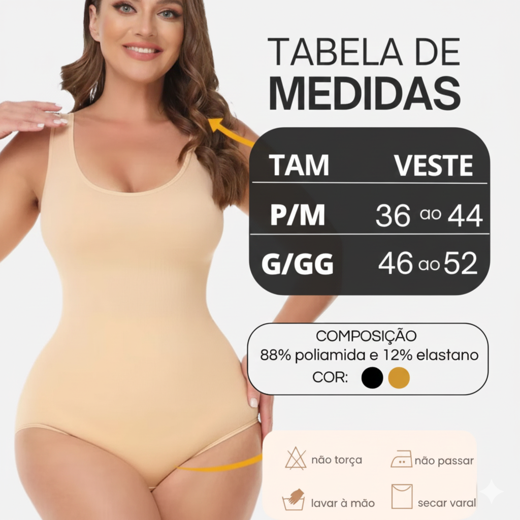 O Body Shaper Modelador foi desenvolvido para modelar o corpo de forma estratégica, oferecendo compressão na medida certa para afinar a cintura, levantar o bumbum, reduzir medidas aparentes e corrigir a postura, tudo isso com conforto e discrição.